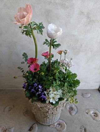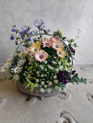 R7年2月 レギュラー教室作品 タイトル 芽吹きのころの寄せ植え 春早い花を集め、フォーカルポイントにオステオ3Dを贅沢に使い、かわいい手つきの籠でギフトにもできるものにしました。 |