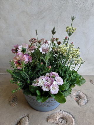 R7年5月 レギュラー教室作品 タイトル 大人かわいい寄せ植え すっと立つサルビア・カラドンナに新発売の優しい色合いペチュニアを加えて凛とした姿と可愛らしさを加えてみました。宿根草が多いので、花後も花壇に定植して楽しんでください。 |