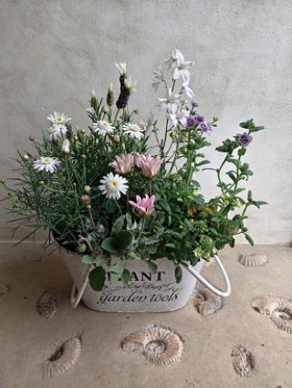 R7年10月 レギュラー教室作品 タイトル 秋の花籠 秋を代表する実物・ゴーテリアやガーデンシクラメン、イベリス・ラベンダー等、普段使わない素材を組み合わせてみました。ハートフルガーデンTanakaにしては少々明るめな組み合わせの寄せ植えとなりました。 |